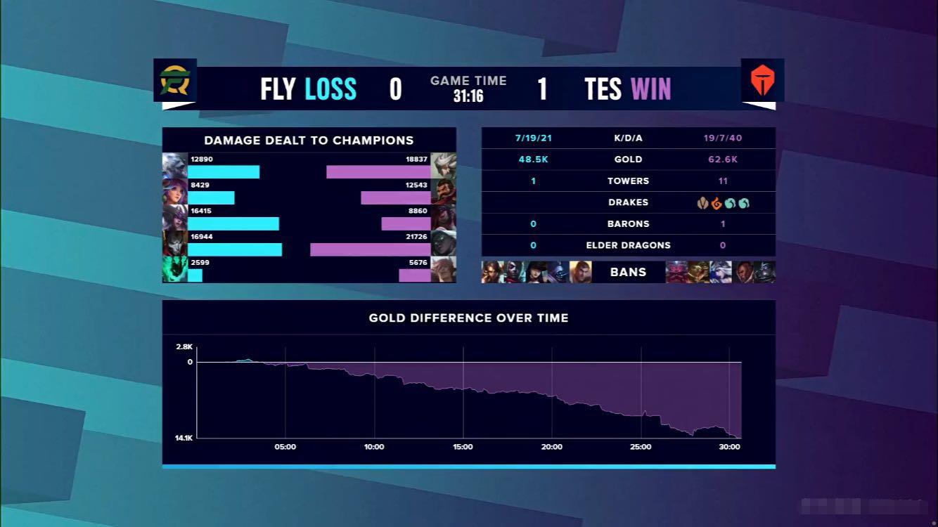 总结:这场比赛赢的还是比较轻松的,经典的雪球局,拿到优势没有给一点机会,从BP上看,TES的阵容上限很高,上中都是刺客,虽然阵容没有FLY扎实,但一旦操作起来将非常无解,本身TES就是靠操作玩游戏的,打起来游刃有余,虽然开局被小小的套路了一下,无关紧要,369的单杀还是非常关键。
