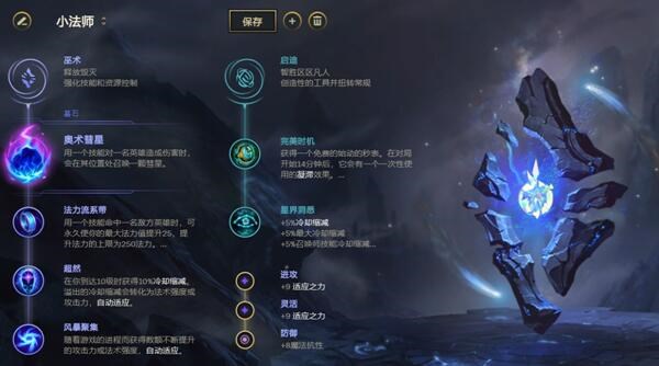 技能加点主Q副W,小法师是一个主发育的中单英雄,对线期利用Q消耗+补尾刀来叠加被动的层数,打好对线的关键是把控好E的一个施放位置,抓对面走位卡E边缘施放接WQ打血量优势,如敌人对线能力偏强,则以E作为反手来保护自己。