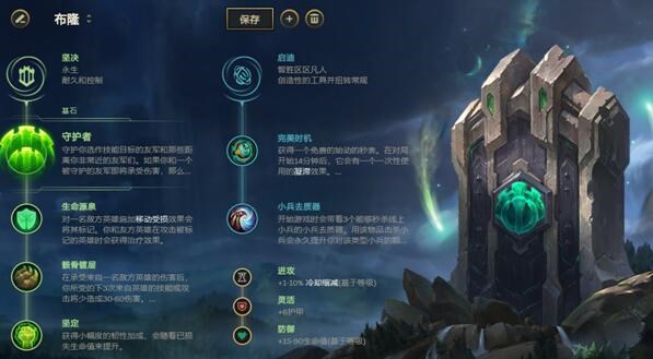 布隆的一个主流符文点法,是选择以守护者为基石符文,搭配队友加成的生命源泉以及骸骨坚定两大符文,主系的点法基本上不会出现什么改变。