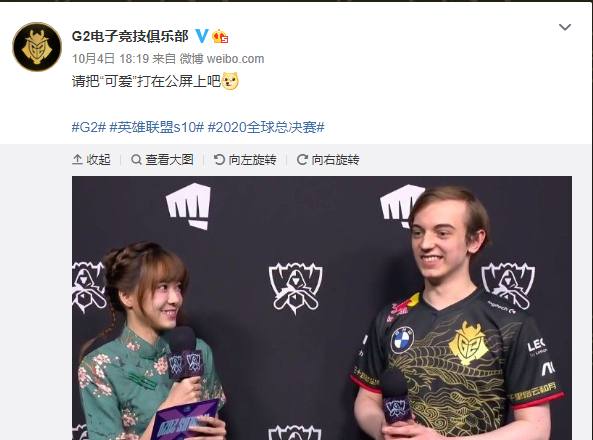 不仅如此!现在的G2已经用目光盯上了我们的主持小姐姐!在帽儿哥接受采访的时候G2官博还跟着起哄,说什么把可爱打在公屏上,难道继欧成余霜之后,又有一位LPL的主持要?可惜我们的观众并不买账,甚至开始翻起了Caps的黑料。