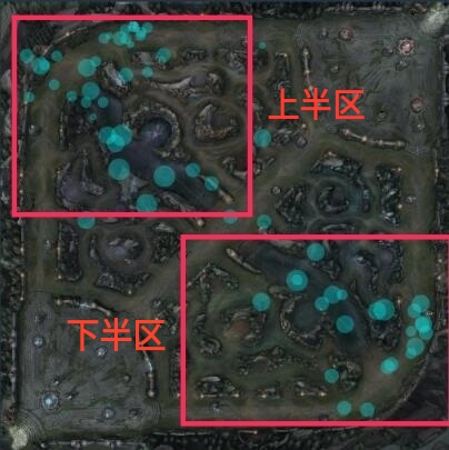 此图为TSM前15分钟击杀助攻点位分布图,从中我们可以明显看出TSM在上半野区产生的击杀数和助攻数要高于下半野区,尤其是在上路产生的击杀和助攻格外密集,这无疑是TSM以上路为核心打法和节奏带动点的最好证明。