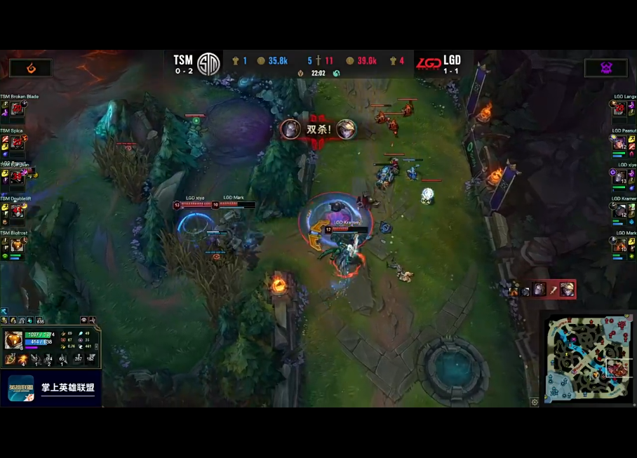 [33:20] LGD直接开打火龙,男枪惩戒抢下小龙,但随后的团战中LGD伤害碾压,LGD打出二换四后推掉了TSM下路二塔和中路水晶。