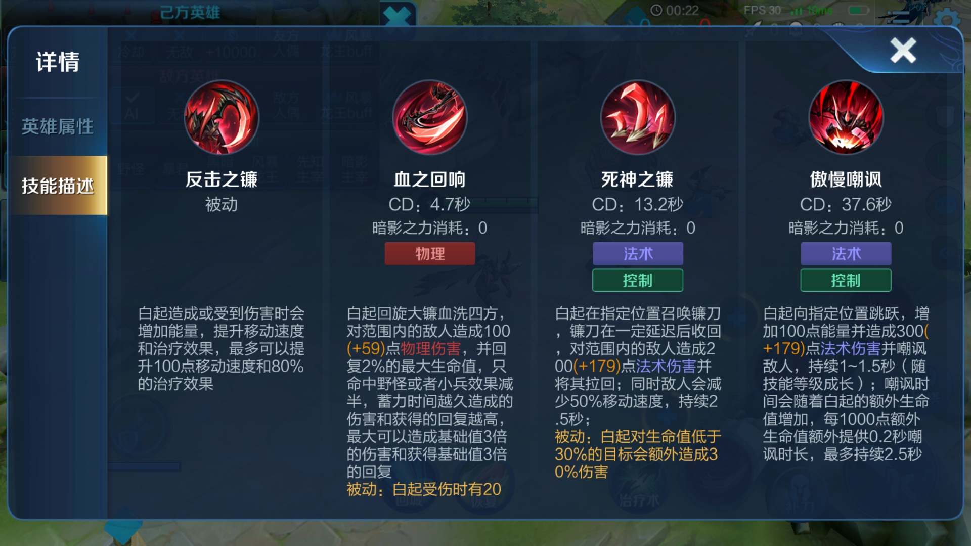 被动技能让白起在受到伤害时提升移动速度和治疗效果,因此很多时候让白起受到小兵伤害提升移速会更有利于快速控制住对手。一技能则是让白起蓄力之后对敌方英雄造成非常高的物理伤害,且被动让白起能够自动触发一技能效果。二技能则是让白起拉回远处的敌人并减少移动速度,是一个不错的控制技能,同时让白起对生命值较低的敌人有终结效果。大招则是白起的灵魂技能,让白起能够嘲讽敌方英雄,同时生命值越高嘲讽时间越长。
