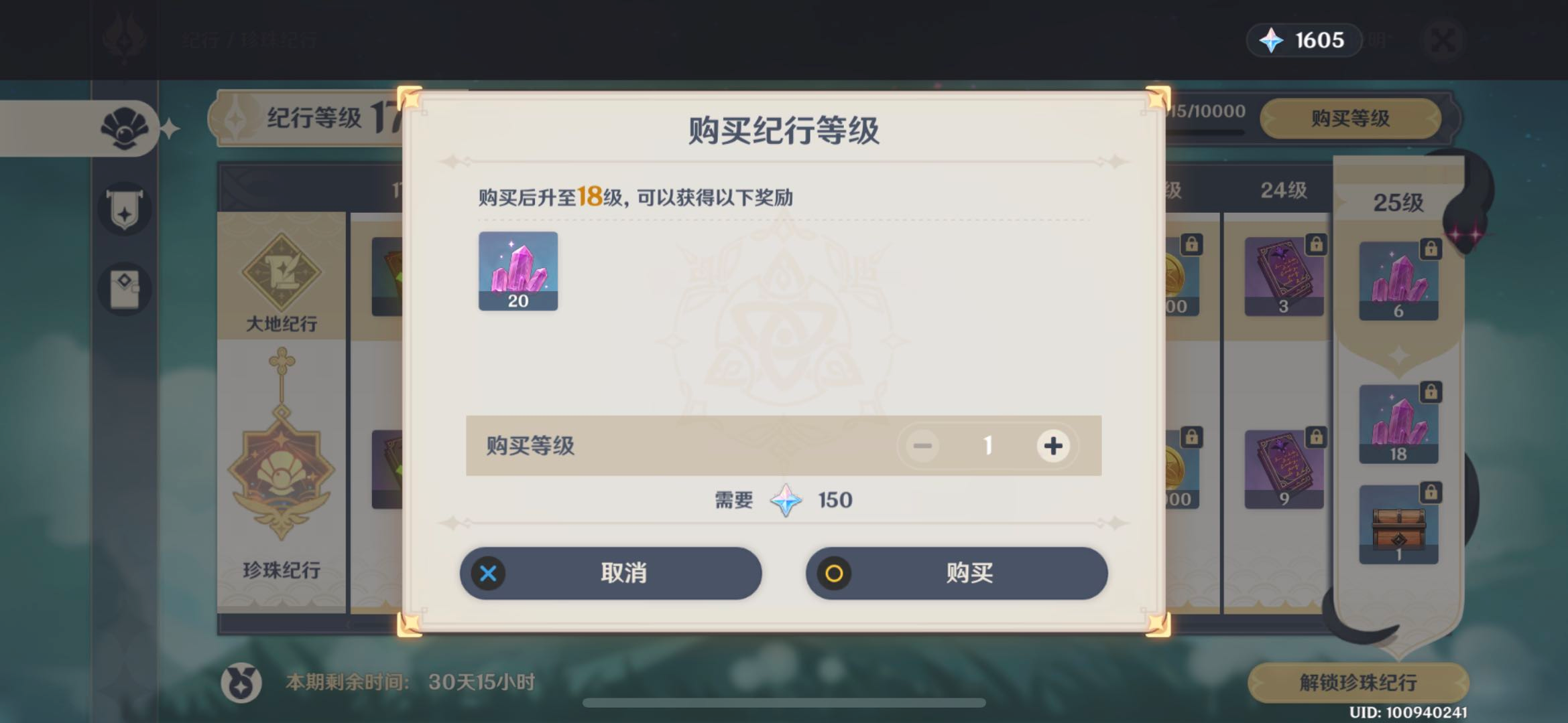 目前珍珠纪行共为50级,每升一级都需要耗费1000点的经验,合计需要5万经验才能满级。每一级都有丰厚的奖励。(有经验,摩拉,武器经验石,天赋技能书,武器,原石等等)旅行者通过完成固定的任务来获得其需要的经验。一期纪行的时间为56天。