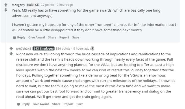 或许有网友期待微软会在今年的 TGA (12 月 10 日)上带来些游戏的新内容,不过根据 343 工作室社区主管 Brian Jarrard 在 Reddit 论坛上的最新回复,这个想法目前希望比较渺茫。