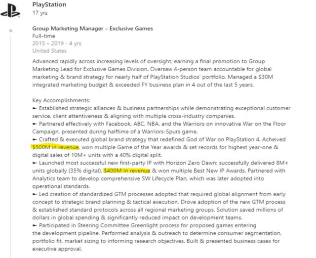 另外,通样来自这位市场人员的履历信息还显示《地平线:零之黎明》为PS带来了4亿美元收益,是最成功的新IP。