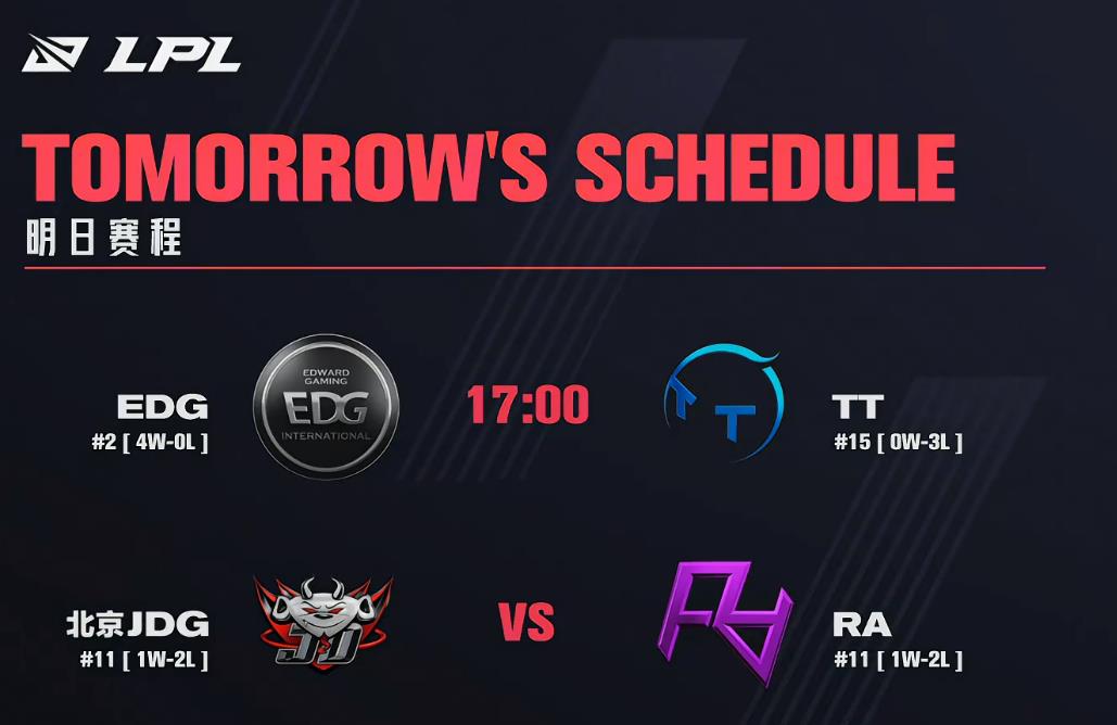 分别是17点EDG和TT的比赛,以及19点JDG和RA的对决。在比赛开始前一天,LPL官方发布了这两场比赛的首发阵容。