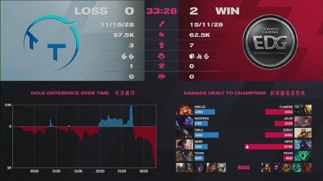尤其是第二局的Viper,用超神的表现展示了何为目前LPL独一档的ADC。在EDG对阵TT的第二局比赛,EDG一度陷入劣势,只有Viper稳健发育以超越时间的补刀让粉丝对他寄予厚望。而Viper也没有辜负粉丝的期望,用凶悍敢打的团战一次次挫败TT的攻势,在中路EDG先少一人的情况下,Viper和队友4V5赢下了团战,帮EDG锁定胜局。