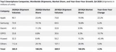 2020 Q4智能手机份额榜 苹果全球第一1月28日上午,知名数据统计机构IDC公布了2020年第四季度全球智能手机品牌市占率数据报告。 从IDC报告公布的数据可以看出,2020年第四季度,全球智能手机出货量为3.859亿台。各品牌市…