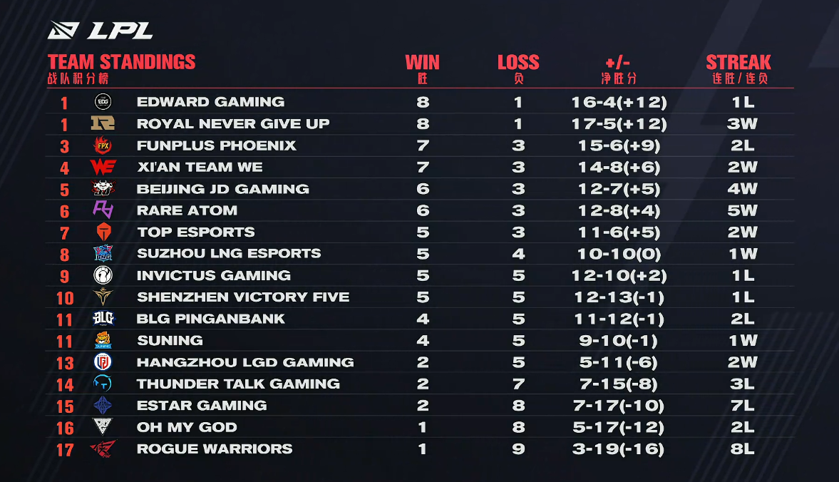 从目前的战队积分榜上来看,排名前四的分别是EDG、RNG、FPX以及WE。特别是EDG与RNG,目前8-1的总战绩可以说是形势一片大好。因为按照以往赛季常规赛季后赛的标准来看,只要是总胜率超过50%就能够有机会进入季后赛。更不用说,当前赛季季后赛名额增加至了10个。而从EDG与RNG的情况来看,即便接下来的比赛他们一场都没拿下依旧是能够获得50%的胜率。也就是说,他们只要接下来再赢一场比赛的话,基本就已经是锁定了季后赛的资格。当然了,对于这两支当前赛季状态大好的队伍来讲,争夺常规赛第一名才是他们应该做的事情。