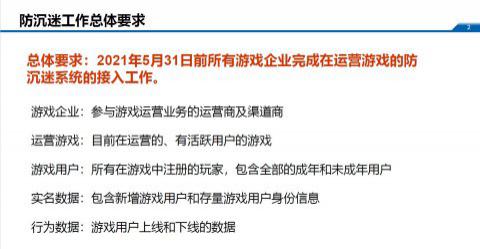 其中传达了防沉迷接入工作时间节点要求,在2021年6月1日前完成接入工作,之后未接入防沉迷系统运营游戏要停止运营。
