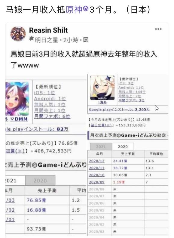 或者可以这么说,《赛马娘》仅3月的收入(目前3月还没结束),就超过了《原神》去年一整年在日本的收入,更是吊打了诸如《怪物弹珠》之类霸榜多年的手游产品。