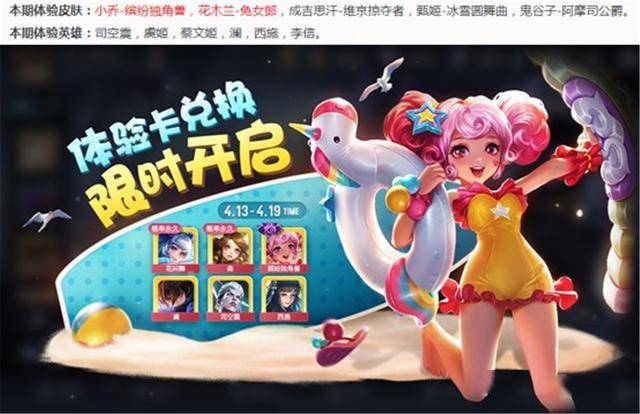 体验卡兑换限时开启7天,一款史诗皮肤体验卡上架( 小乔的缤纷独角兽),以及热门皮肤花木兰-兔女郎体验卡也上架了,兑换一份小礼包有0.1%的概率抽到 公孙离或瑶的伴生皮肤。