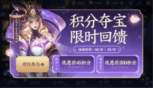 积分夺宝将在4月16日0点开启限时折扣活动,需要荣耀水晶的玩家可以参与一下,但这周没有上线的充值活动。