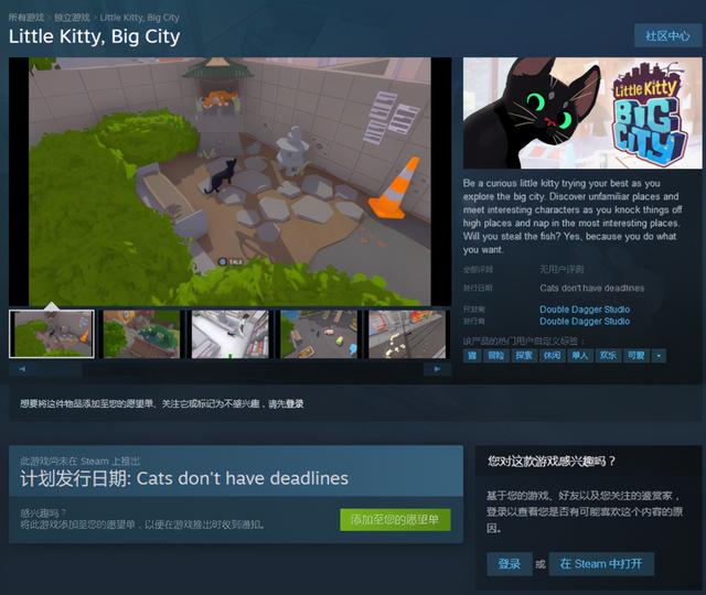 由开发商DoubleDaggerStudio制作并发行的《小猫咪,大城市(LittleKitty,BigCity)》是一款猫咪模拟游戏,今天(5月18日),该作上架了Steam商城,游戏支持简体中文,暂未公布具体发售日期,和可爱的猫咪一起探索城市,喜欢猫咪的朋友千万不要错过,敬请期待。