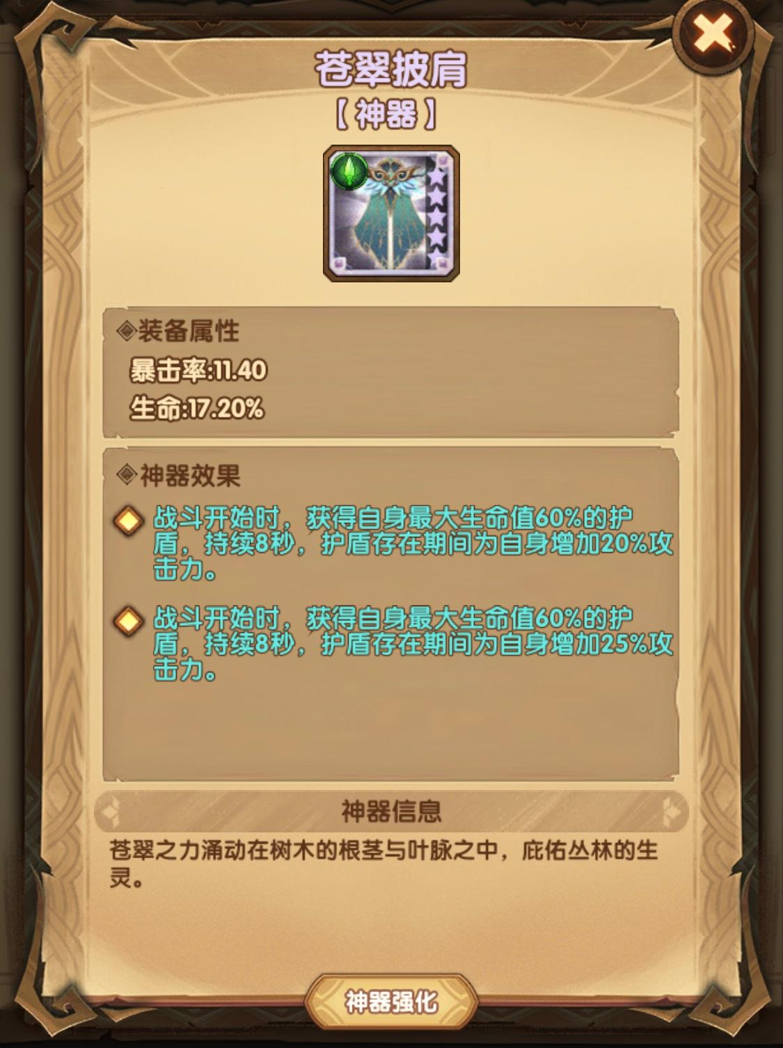 装备属性提供暴击率、生命值。战斗开始时,获得自身最大生命值60%的护盾,持续8秒,护盾存在期间自身增加25%的攻击力。
