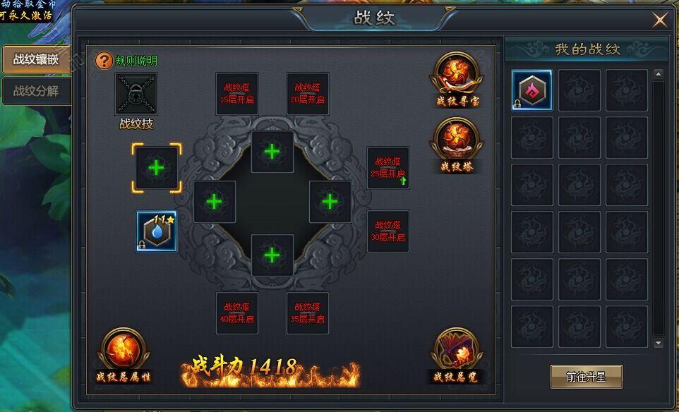 玩家要想获得各种战纹,可以通过挑战战纹塔获得,或者从战纹寻宝的玩法,可以获得各种战纹。低级的战纹可以分解成战纹经验值,用于战纹的升星;而高级的战纹可以用来合成更高的战纹的。