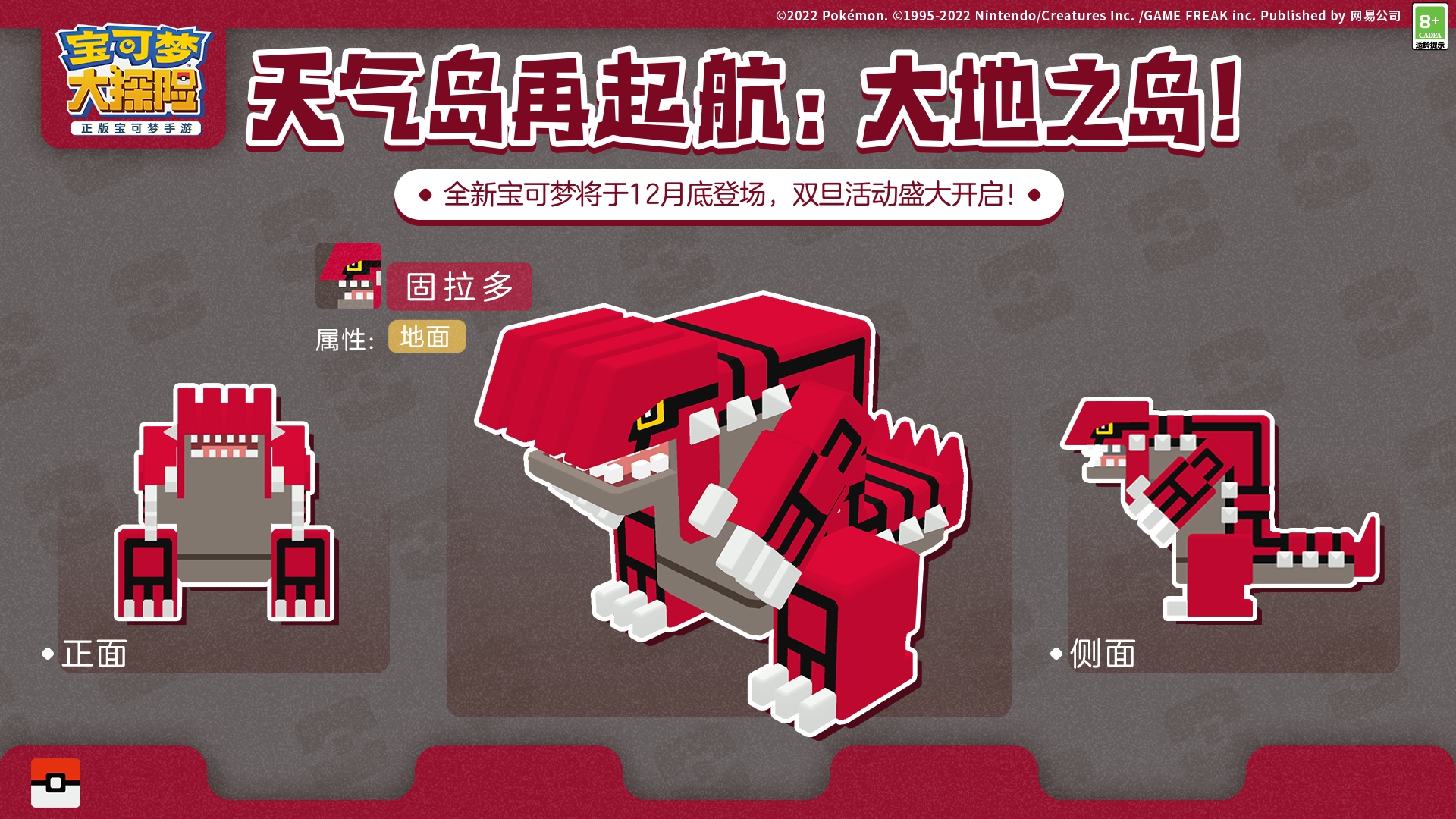 在大地之岛的旅程中,超古代传说宝可梦固拉多带给探险家十足酷炫的印象。传说它是大地的创造者,具有掌控光和热的强大能力。全身披着红色片状鳞片的它,自带坚不可摧的天然甲胄,身上突起的尖刺和充满力量的四肢、尾巴,更是让它充满霸气又神秘的气息。
