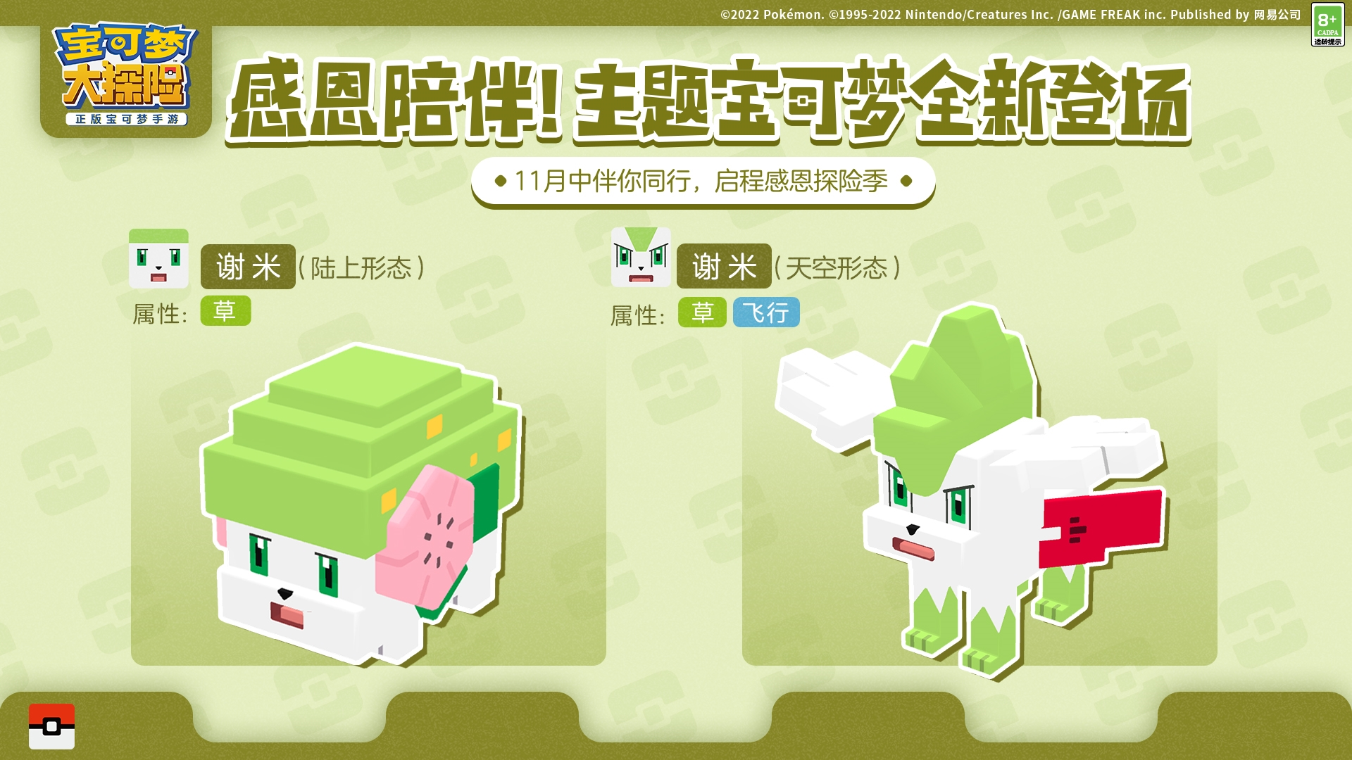 因为感恩季的主题是感谢,自然少不了可爱的谢米啦!当这位宝可梦伙伴被探险家们温柔地抱在怀中,感受到人们内心的感恩之情时,全身的鲜花都会绽放。这也是谢米向探险家们献上的节日花束,大家记得收下这份来自宝可梦的祝福哦!