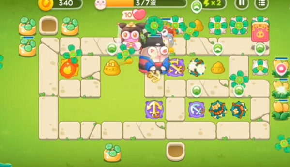 1、首先我们开局在右上角位置建造四叶草以及分裂箭,进行升级。