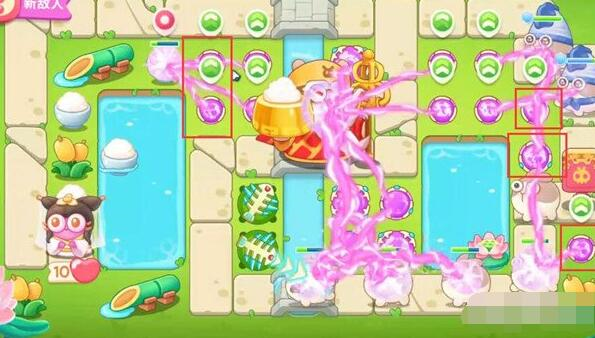 6、我们第四波开始把1魔法球升级,打米饭,放置2魔法球,右边图开后再放置两个魔法球,同时接着打附近道具。