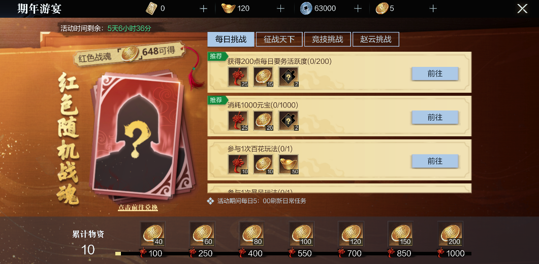 8月13日-8月28日,完成限时军务获取周年纪念币,即可在【周年商肆】中兑换红色随机战魂、精致无双令等各种珍贵奖励。