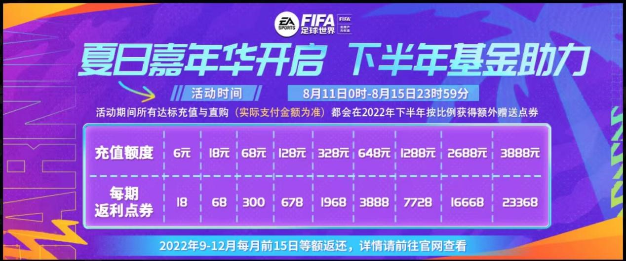 随着夏日嘉年华的开启,下半年基金助力玩家畅享绿茵!玩家充值不同额度,即可在2022年9-12月收获不同数量点券的返利,超值优惠,不容错过!